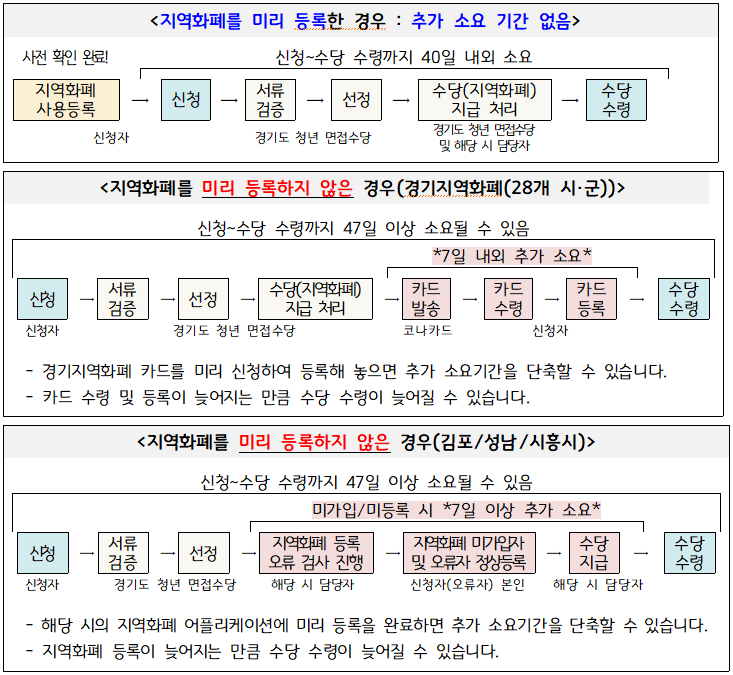 - 김포/성남/시흥시를 제외한 28개 시·군의 지역화폐를 처음 이용하는 분이라면 경기지역화폐 애플리케이션에서 미리 실물카드를 신청하고 등록하기를 권고합니다. 그렇지 않은 경우 아래와 같은 진행 절차에 따라 수당 수령까지 추가 기간이 소요됩니다.