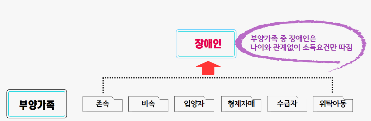 만약, 부양가족 중에 장애인이 있을 경우 장애인은 20세 이상이던, 60세 이하던 관계없이 "소득요건"만으로 인적공제 대상 여부를 판단합니다.