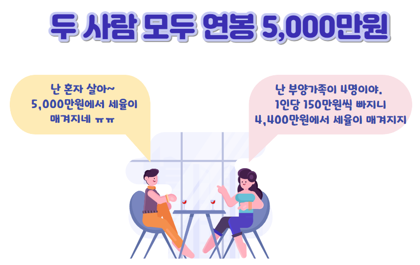 역으로 말하자면, 내가 번 돈으로 혼자 산다고 하면 부양가족이 있는 사람보다는 세금을 더 많이 내게 됩니다.