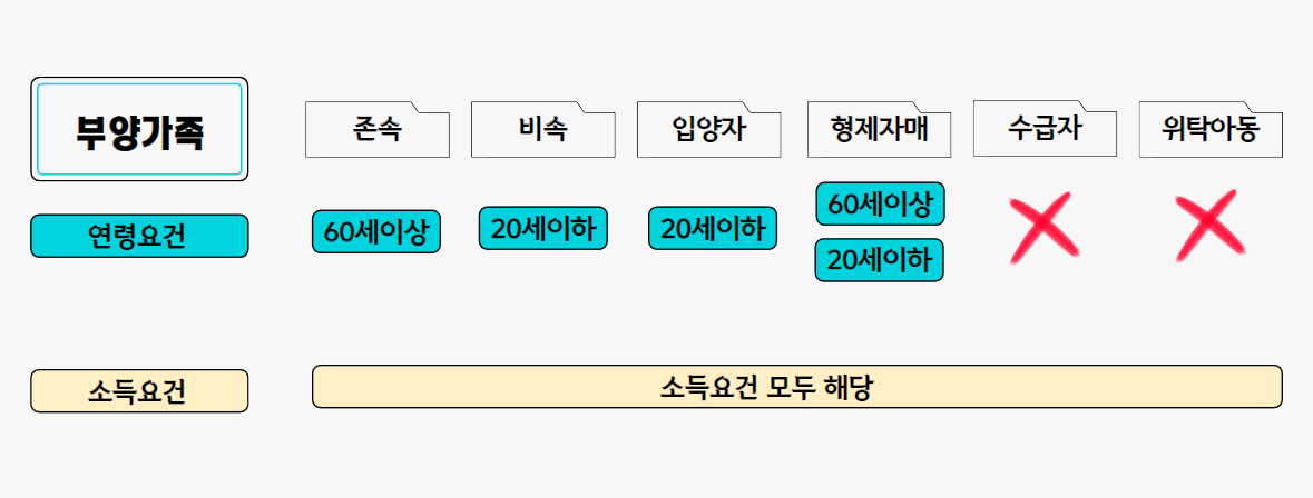 직계비속(자녀)의 경우 나이가 만 20세 이하, 직계존속(부모)는 만 60세 이상이 되어야 합니다.