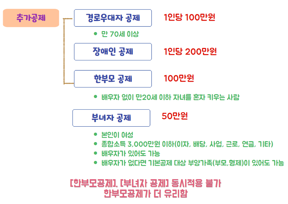 경로우대자 공제, 장애인 공제, 한부모 공제, 부녀자 공제의 요건을 잘 확인하시고 본인이 받을 수 있는 혜택을 잘 확인하세요.