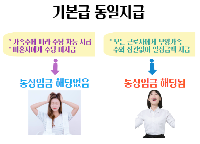 반면에 모든 근로자에게 부양가족 수에 상관없이 일정 금액을 기본금액으로 지급하는 가족수당은 통상임금에 포함됩니다.