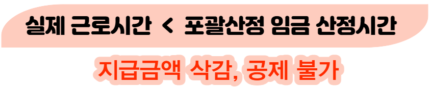 반대로 포괄산정 임금계약을 체결하여 지급한 연장근로수당 등이 실제 근로한 시간을 기준으로 산정한 금액보다 많은 경우에는 고정으로 지급되는 연장근로수당 등을 삭감 또는 공제할 수 없다는 것이 고용노동부의 해석입니다. 이 부분은 사용자의 입장에서는 불리할 수 있는 부분이니 반드시 유념해야 합니다.