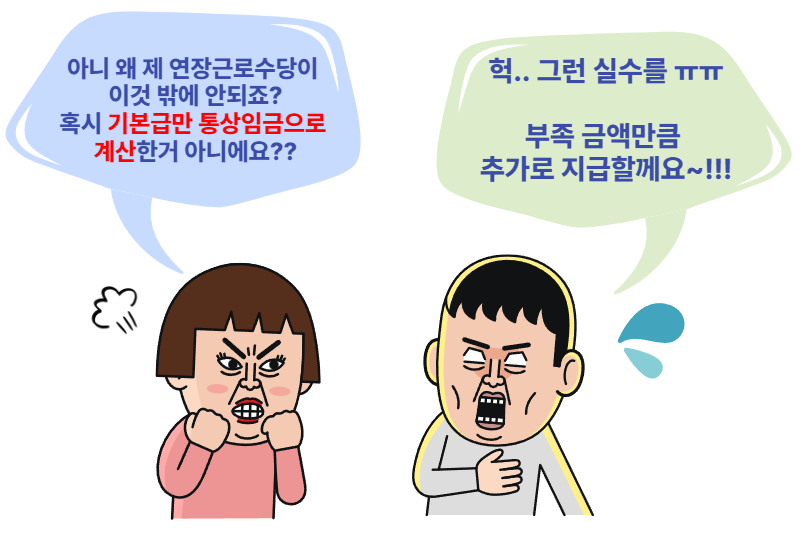 통상임금 산정시 기본급만을 적용하거나 통상임금에 포함되는 수당을 누락하고 통상임금을 산정하는 경우입니다.