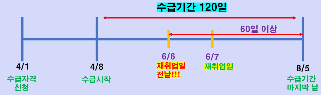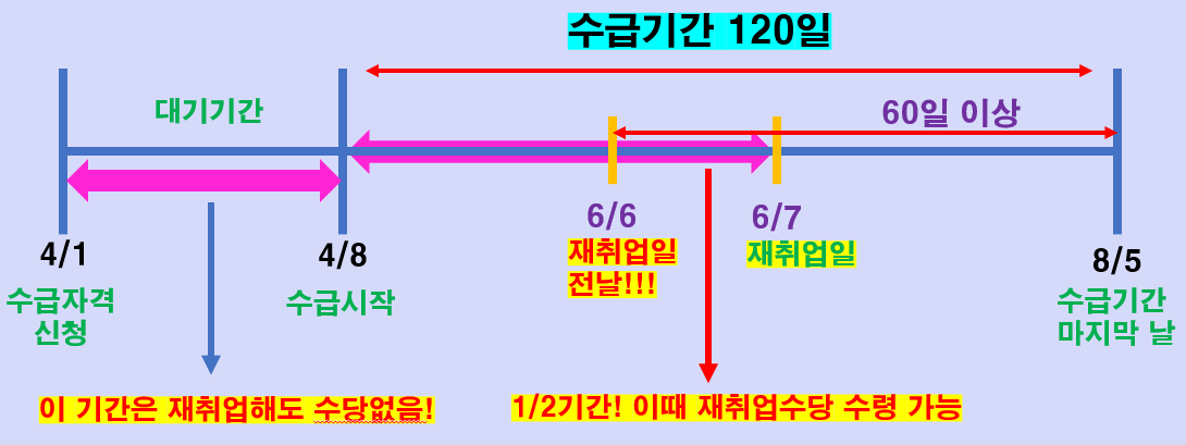 그리고 중요한 점 하나 더 말씀드리자면, 수급자격 신청을 하고 수급기간이 도래하기 전의 대기기간 중에 재취업했다면 지급받을 수 없습니다.
