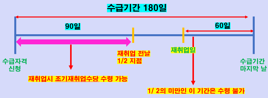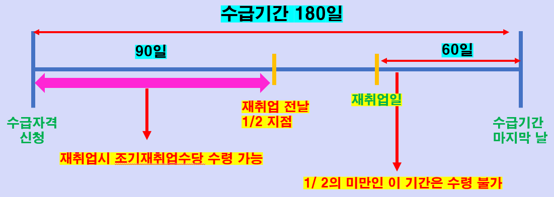 대기기간이 지나고, 재취업한 날의 전날이 소정급여일수의 1/2이 되는 그 사이의 기간동안 재취업을 해야 조기재취업수당이 지급됩니다.