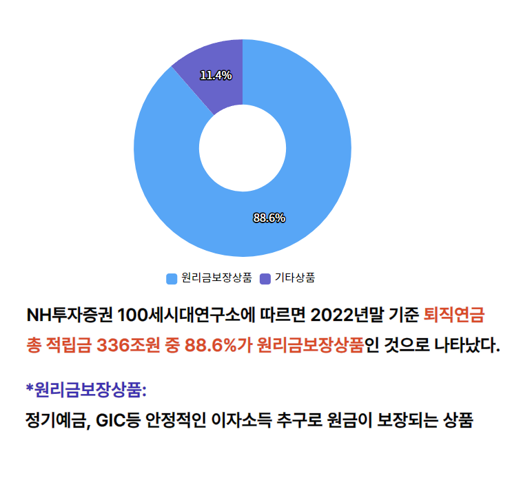 NH투자증권 100100세 시대 연구소에 따르면 2022년 말 퇴직연금 총 적리금 336조원 중 무려 88.6%가 원리금보장상품인 것으로 확인되었습니다.