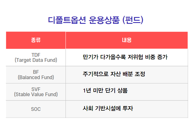 우선 펀드를 디폴트옵션으로 선택할 경우 TDF, BF 중 반드시 한 가지는 담도록 하고 있습니다.