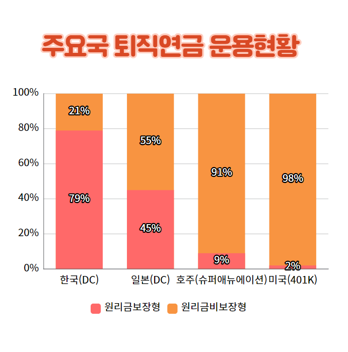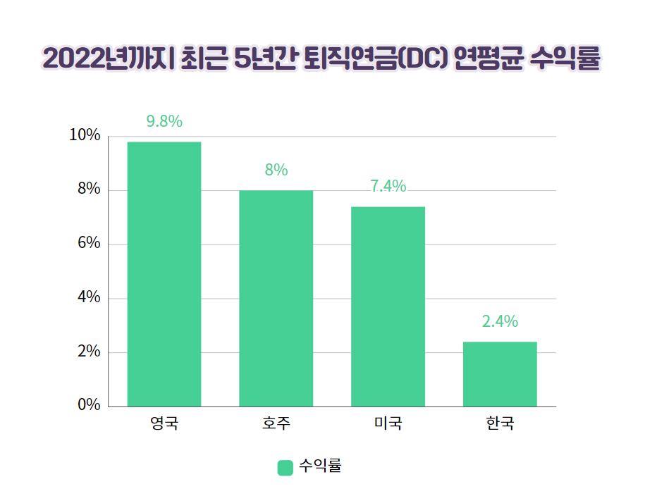금융감독원에 따르면 2021년까지 대한민국의 DC형 퇴직연금 연평균 수익률은 2.4%로 영국, 호주, 미국에 비해 굉장히 낮습니다. 시중 은행의 정기예금 금리 수준이었습니다.