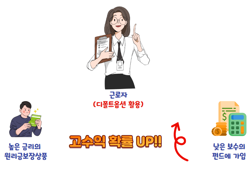 디폴트옵션 활용 시 보다 높은 금리의 원리금보장 상품과 낮은 보수의 펀드에 가입해 더 많은 수익이 날 확률이 높아지게 됩니다.