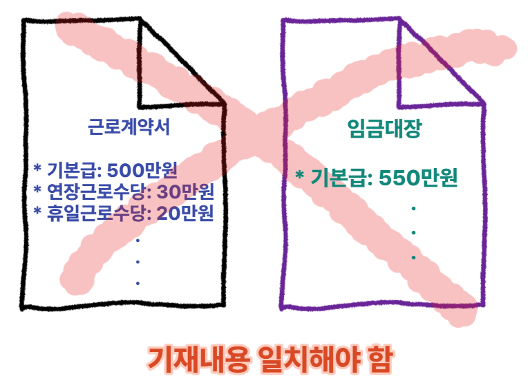 | 기재 내용 상이 | 계약서와 임금대장에 내용 상이 |